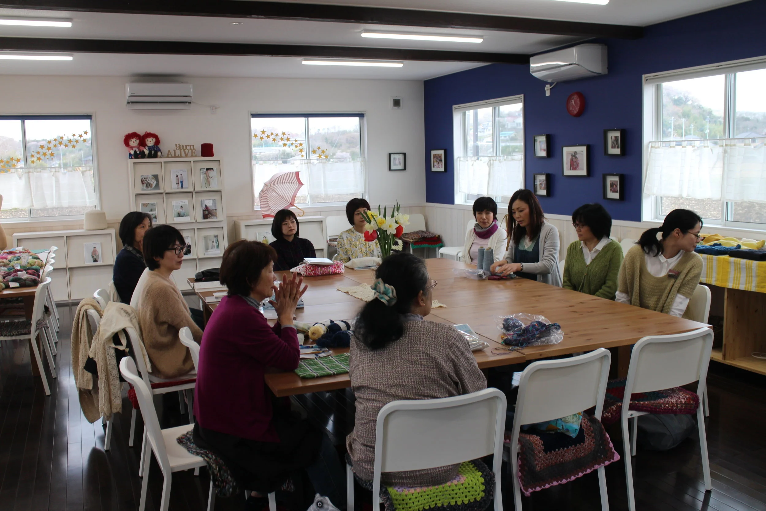 michiyoさん部活第1日目はどんよりな天気でしたがヤーンアライブハウスの中は皆さんの活気と笑顔と毛糸や作品でカラフルになりました!Some pictures from the first day of michiyo's workshop last week. The weather was grey and cold outside, but inside of Yarn Alive House was full of smiles and colors!